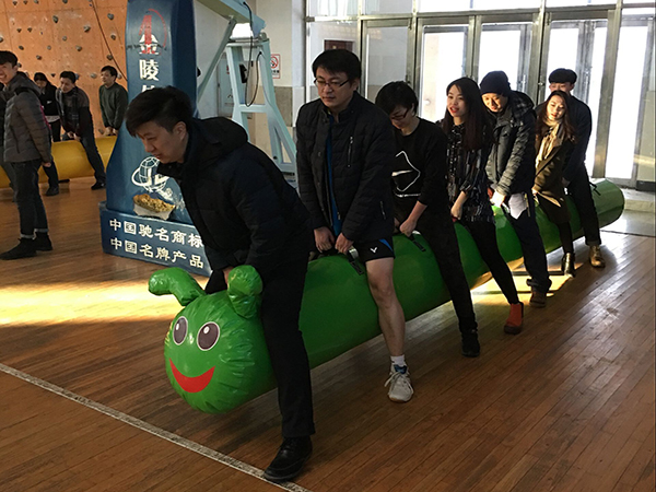 《毛毛虫竞速》游戏规则:每个部门出八名队员,8人统一骑在毛毛虫上前行,双手握住把手不得松开,毛毛虫不准许拖地跑,双脚不准许腾空,毛毛虫尾部通过终点线后计时停止。