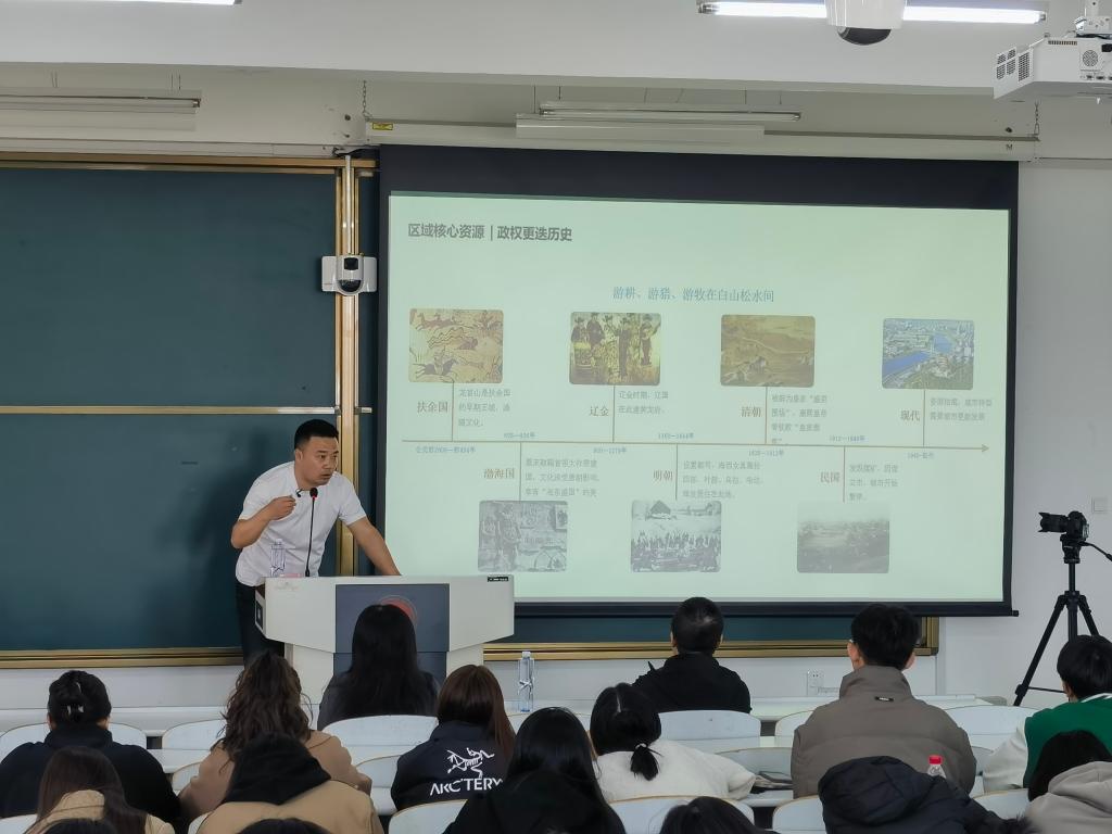 讲座邀请到吉林省旅游协会副会长、民宿客栈分会牵头人、这有山创始团队民宿项目设计师、中国传统村落北兴村保护性开发项目发起人、文化赋能长白山地区乡村振兴特邀专家、《中国大百科全书》吉林村落特征及中国传统村落吉林卷编撰人王立夫进行现场分享。