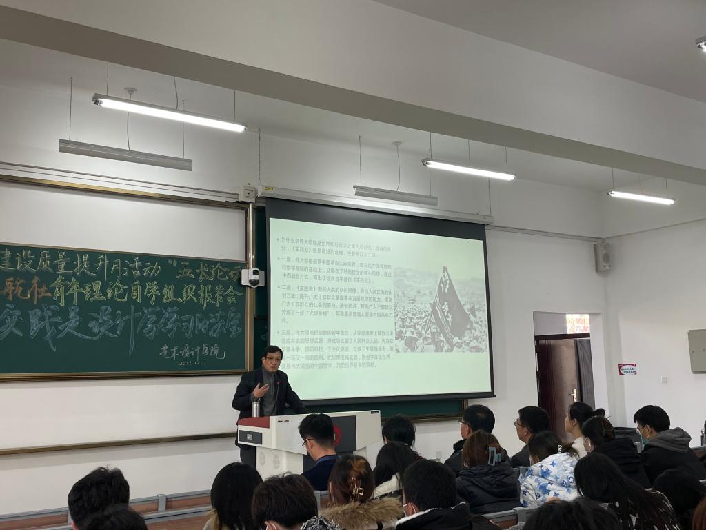 李春郁教授首先结合自身学习毛泽东《实践论》的心得与同学们进行了交流,强调《实践论》是对马克思列宁主义实践理论的新发展,是毛泽东思想的基础之一。该著作科学总结了毛泽东的思想方法与工作方法,实现了辩证唯物主义的基本原理与中国革命的具体实践的结合。李春郁教授还结合艺术学院学生专业学习的实际,讲到实践是设计学学习的法宝,号召同学们多参加专业实践和社会实践,在实践中不断加深对事物的认识,摸索出事物发展的规律,从而提升自身的设计能力和水平。