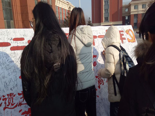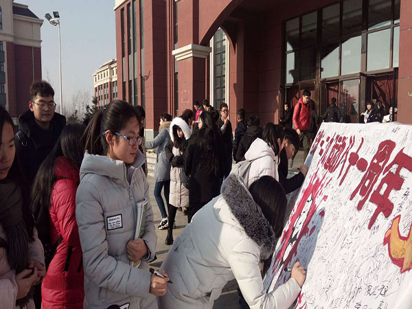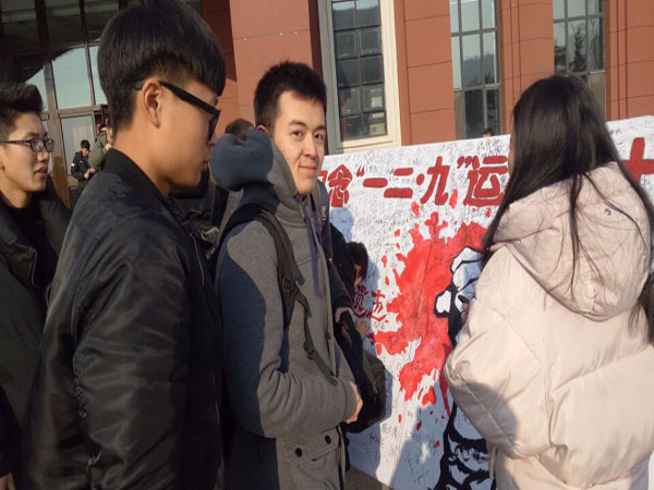 12月9日,艺术设计学院、纺织服装学院学生会在北湖校区开展了纪念一二九运动八十一周年“秉承先辈遗志,高擎时代火炬”的主题签名活动。主目的是为弘扬以“爱国主义”为 核心的伟大民族精神,唤醒广大青年学子的爱国情怀,增强大学生的光荣感、责任感和使命感表达自己的决心。