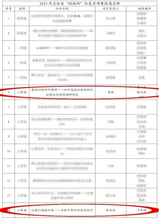 本网讯(通讯员: 宋姗珊)近日,2024年吉林省"挑战杯"红色专项赛评选结果揭晓。我院楚玉彪、侯天放、尚彤三位教师指导,崔健等10名学生完成的作品《感悟四战四平精神——四平战役纪念馆认知现状及原因调查研究》获二等奖;于丰硕指导,朱世承等4名学生完成的作品《让我们荡起双桨——胶片影印中的历史长河》获三等奖,创学院历史最佳成绩。