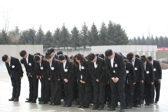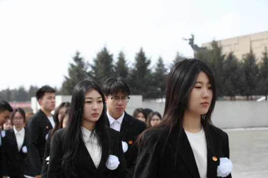 学院学生代表胸戴亲手制作好的白色胸花,手捧黄白菊花,依次瞻仰烈士纪念碑,向革命先烈敬献鲜花,致以崇高敬意。
