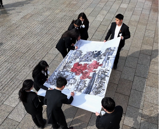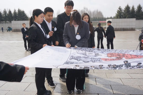 同学们绘制的清明祭英烈画卷也带到了现场,画卷中不仅描绘了革命战士冲锋陷阵的场景,还刻画了先烈们坚毅的神情。学院学生代表依次走到画卷前,认真地签下自己的名字,每一个签名,都是一份承诺,承诺将铭记英烈们的奉献与牺牲,传承他们的精神。