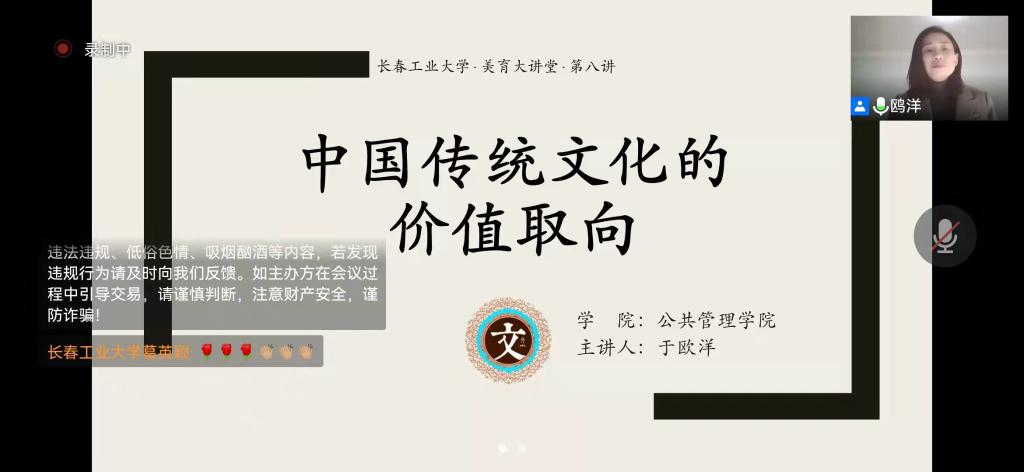 4月5日晚19:00推出了美育大讲堂最后一讲公共管理学院于欧洋老师的《中国传统文化的价值取向》,讲座主要解读在建党95周年庆祝大会的重要讲话中提到“我们要坚持道路自信、理论自信、制度自信,最根本的还有一个文化自信。”那么什么是文化自信?我们又因何而“自信”?我们文化自信的底气何在?这就是我们博大精深的优秀传统文化。它“增强做中国人的骨气和底气”,是我们文化发展的母源,是中华民族最深沉的精神追求。