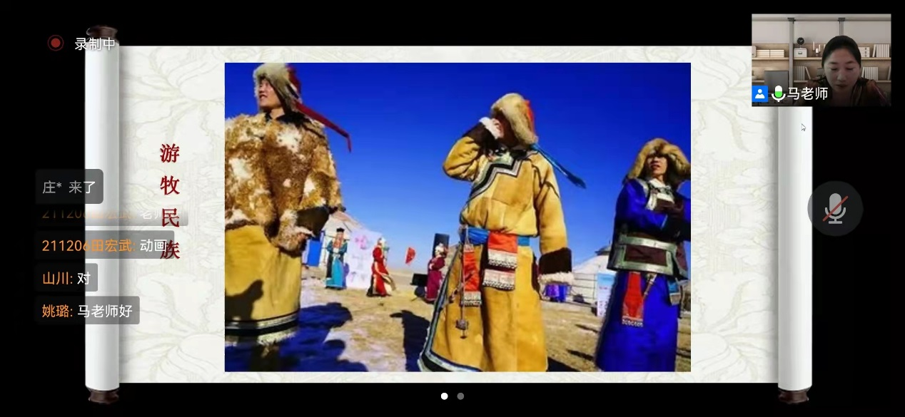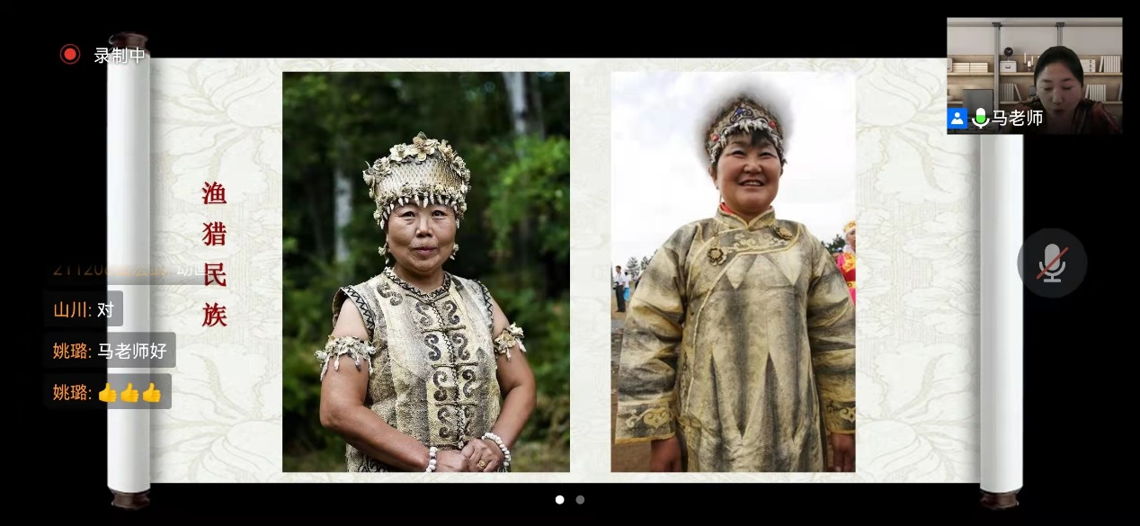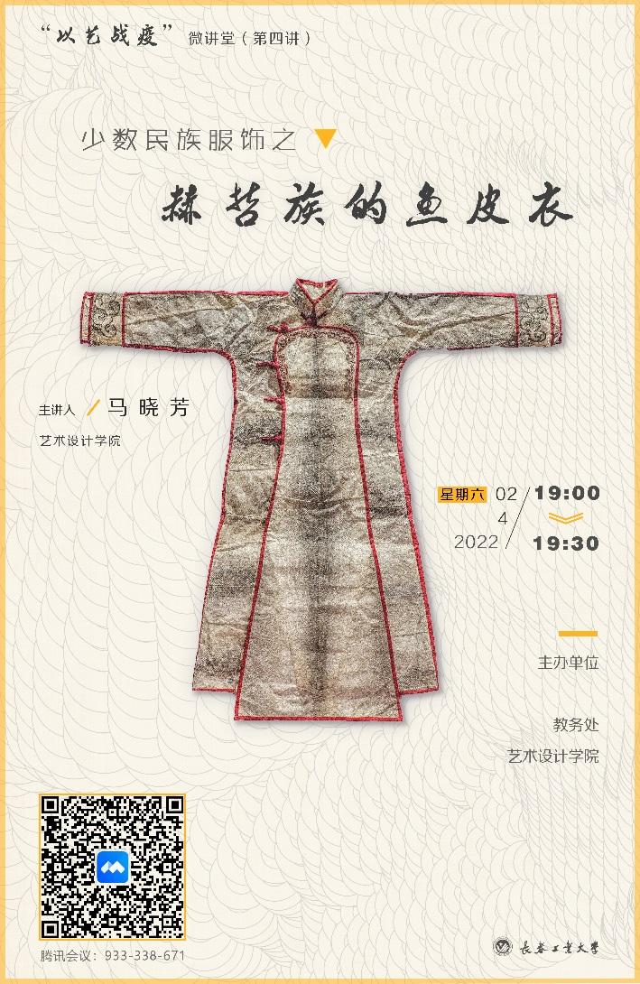 4月2日晚19:00时,第四讲《少数民族服饰之赫哲族的鱼皮衣》由艺术设计学院马晓芳老师主讲。马晓芳老师讲授了赫哲族的历史和文化,通过专题短片介绍了怎样将鱼皮制作成为可以具备折叠、缝合条件的制衣材料。同时演示了拼花、拼色,特殊的缝合技法,将一件具有赫哲族特色的鱼皮衣制作完成的过程。
