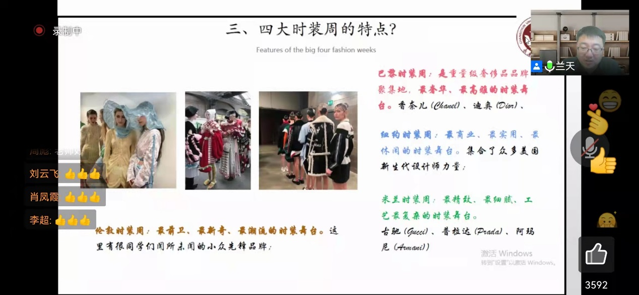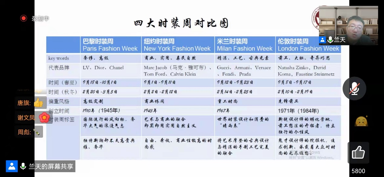 4月4日晚19:00时,第五讲《时装周的前世与今生》由艺术设计学院兰天老师主讲。兰天老师从时装周的缘起、发展,目前全球范围内四大时装周的代表品牌、发布时间、偏重风格等做了对比分析。同学们纷纷表示对于每年喜欢的新春时装发布活动轨迹有了全新的认识,特别适合青年人追逐生活中时尚风潮。