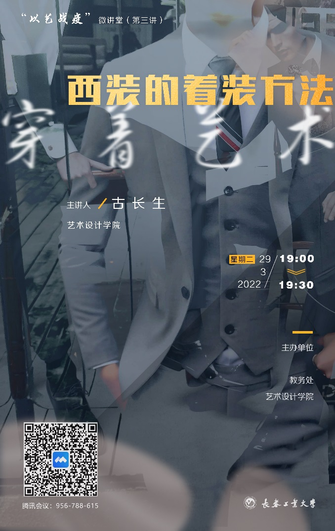 3月29日晚19:00时,《西装的着装方法》由艺术设计学院教师古长生老师主讲。云端200余人共同观看讲座,古长生老师从西装的演进历史讲解入手,对于西装着装要求和基本礼仪,通过历史照片和图片生动的为师生们娓娓道来。讲座现场热烈,受到广大师生的好评。