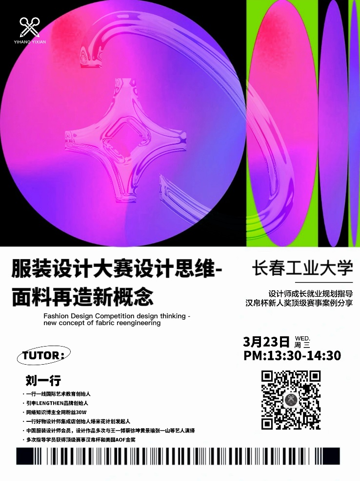 3月23日,服装系特邀引申品牌创意总监、北京一行一线国际时装教育机构创始人、世界技能大赛特聘专家刘一行老师做《服装设计大赛设计思维——面料再造新概念》的专业讲座。本讲座主要涵盖三个方面内容:1.顶级AOFF(Arts of Fashion Foundation)时尚艺术设计大赛金奖作品剖析;2.汉帛、新人奖获奖作品思路解析;3.服装设计赛事面料再造趋势预测。
